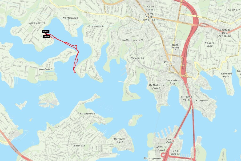 Woodford Bay along Lane cove River to the junction of the Paramatta River and return, 3.5km round trip.